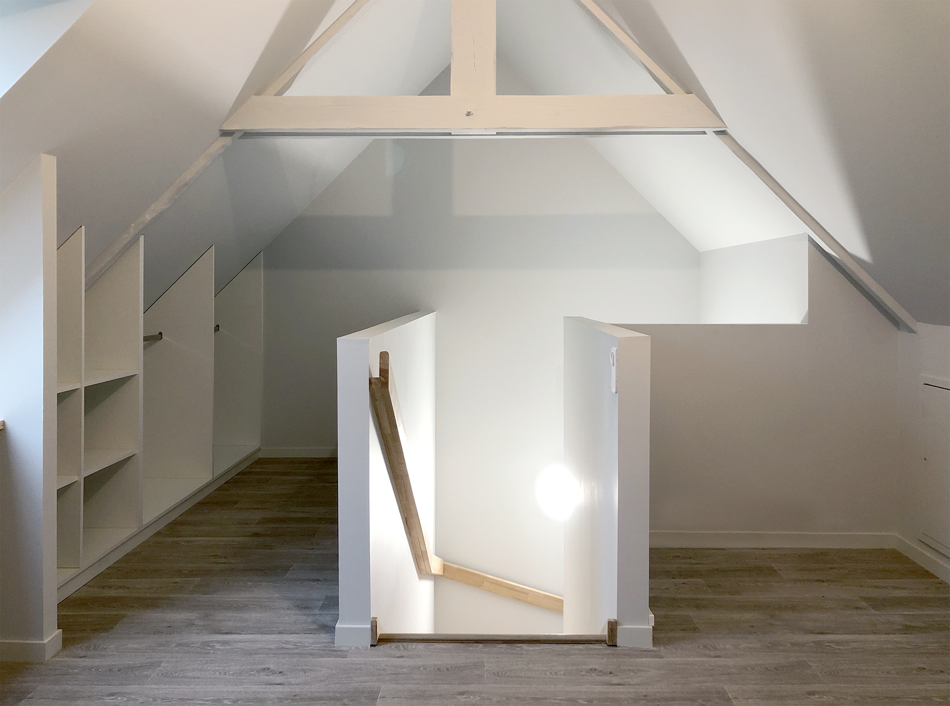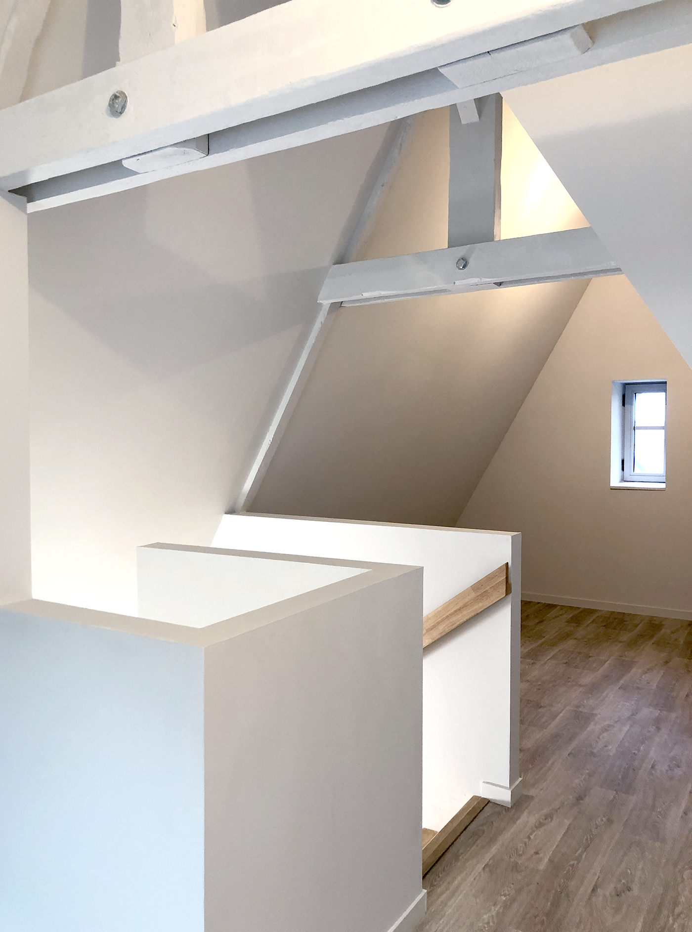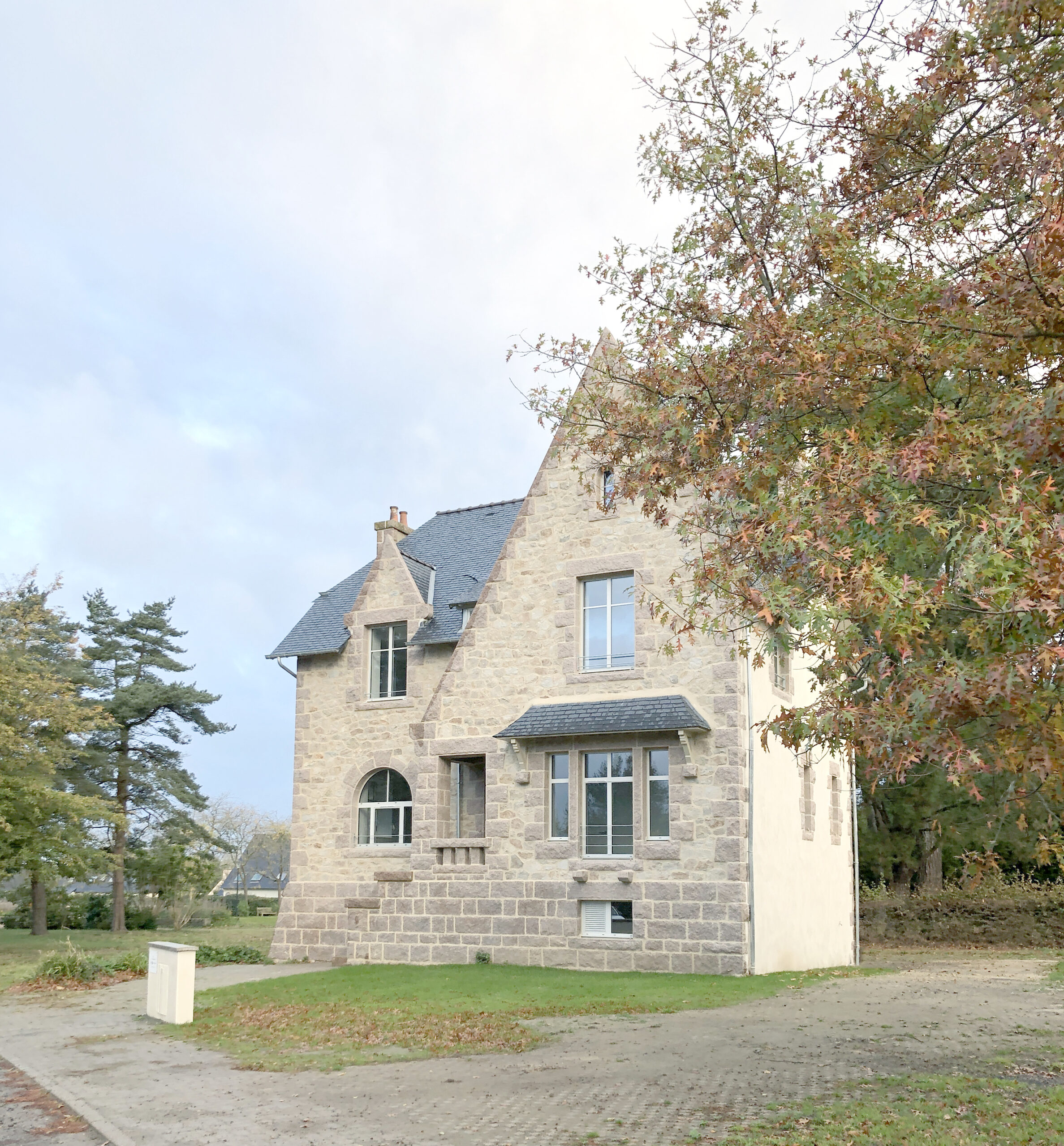 Réhabilitation lourde d’une belle bâtisse des années 30 pour y créer 3 logements sociaux atypiques : 1 T4 de plain pied et 2 T2 en duplex (accompagnés d’une cave en sous-sol). Les matérialités présentes telles que la façade pierre et la charpente ont été conservées et révélées. Un escalier extérieur est créé pour accéder aux logements des étages, sans dénaturer l’existant.